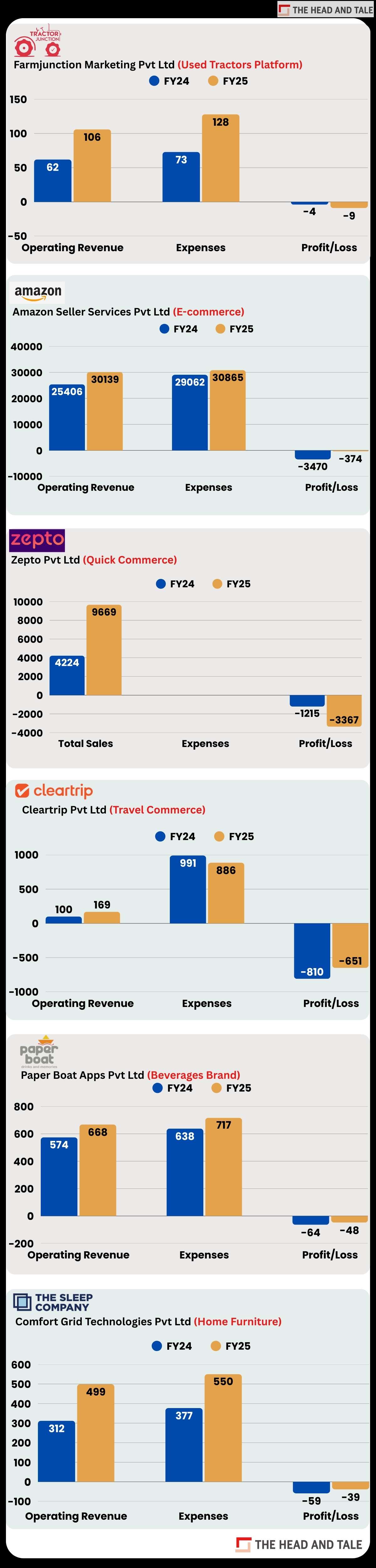 Tractor Junction, Amazon (E-commerce), Zepto, Cleartrip, Paper Boat, The Sleep Company π