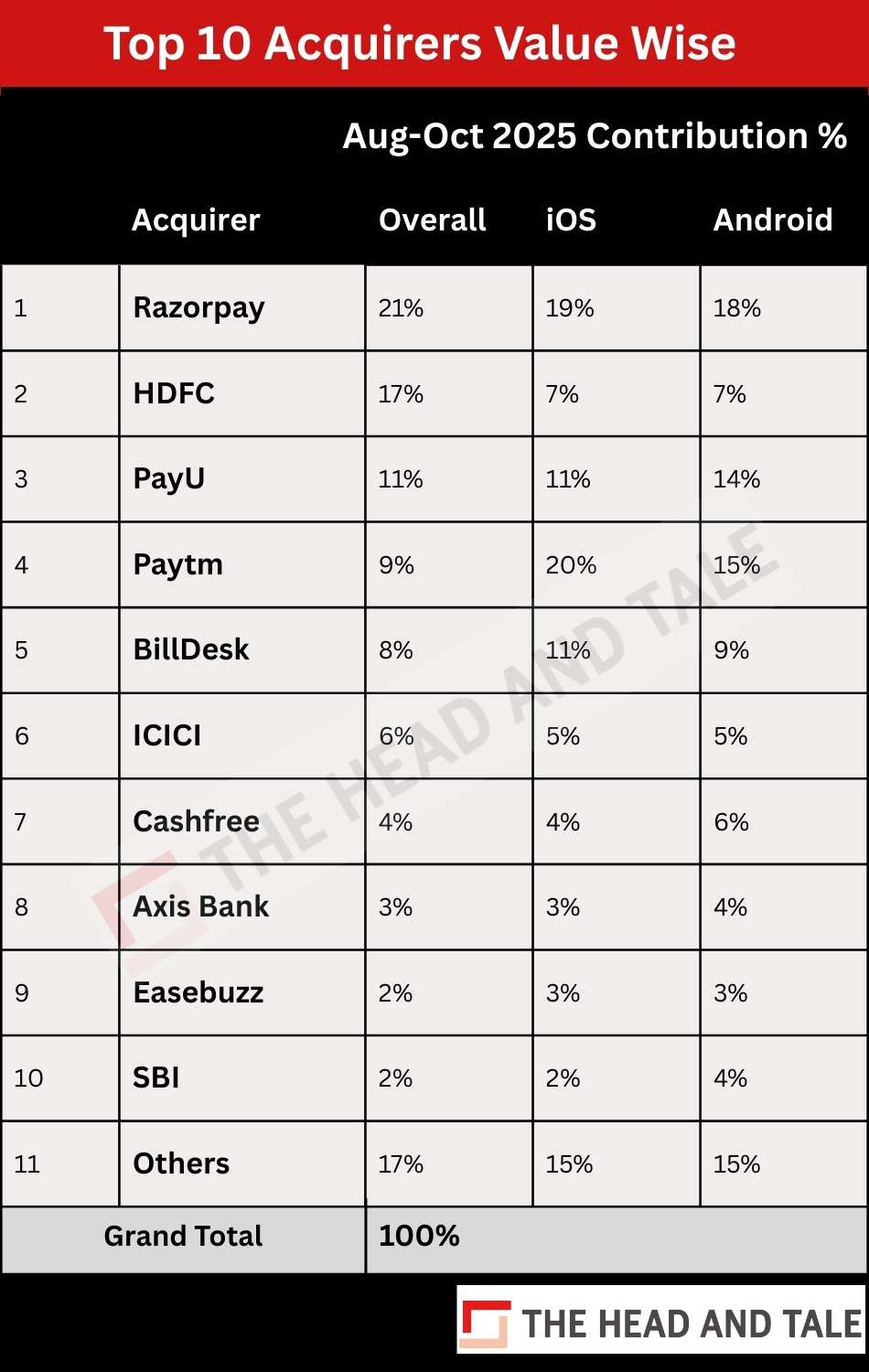 HDFC's contribution stood at 7% each from both platforms; while PayU showed a stronger tilt towards Android (14%) compared to iOS (11%).