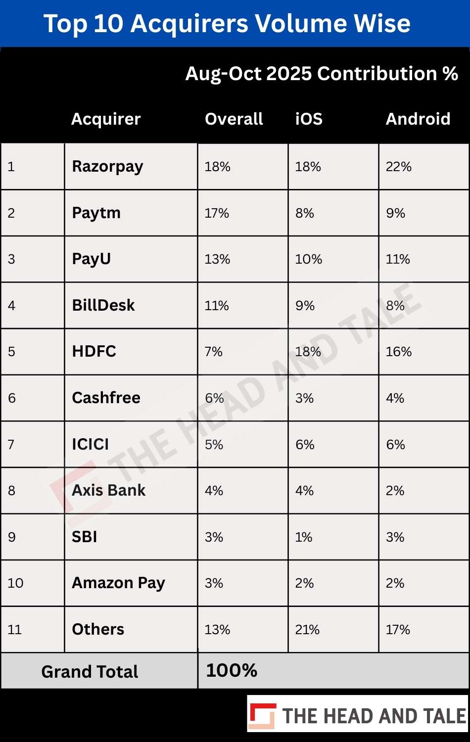 PayU ranks third with 13% of total volumes, followed closely by Billdesk at 11%. HDFC Bank, despite being the second-largest in value terms, handles only 7% of volumes – but shows an unusually high 18% share on iOS.