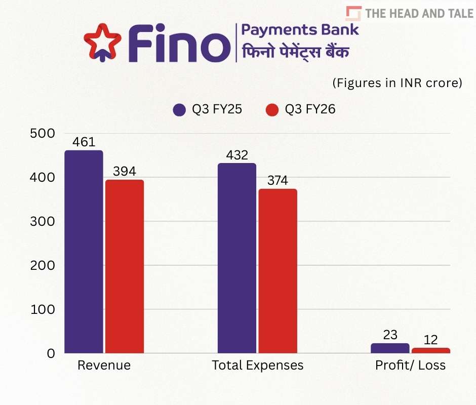 Fino Payments Bank's net profit nearly halved to Rs 12.3 crore in Q3 FY26 from Rs 23.1 crore in the previous fiscal, according to regulatory filings with the stock exchanges.