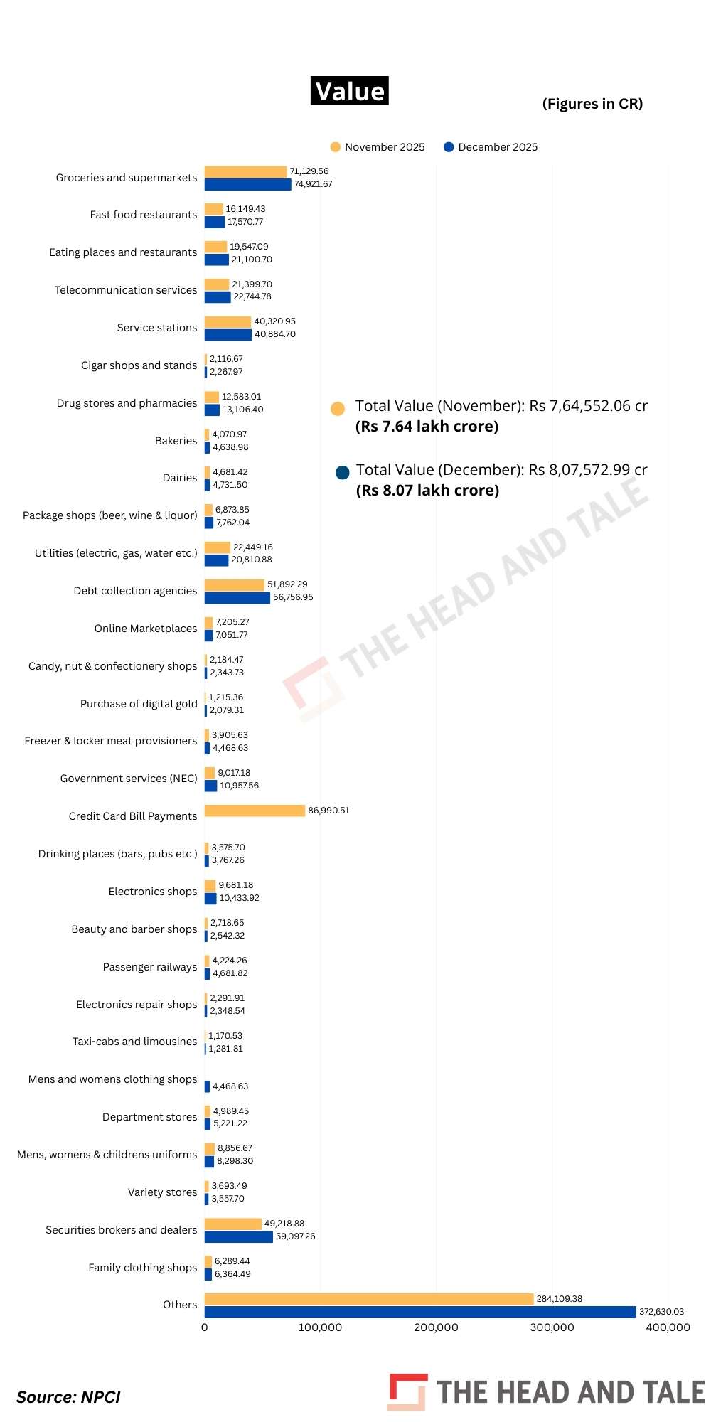 13 Jan 2026, 08:09 PMThe overall value of the merchant category-wise purchases via UPI rose to Rs 8.07 lakh crore in December across 13,482.38 million transactions.