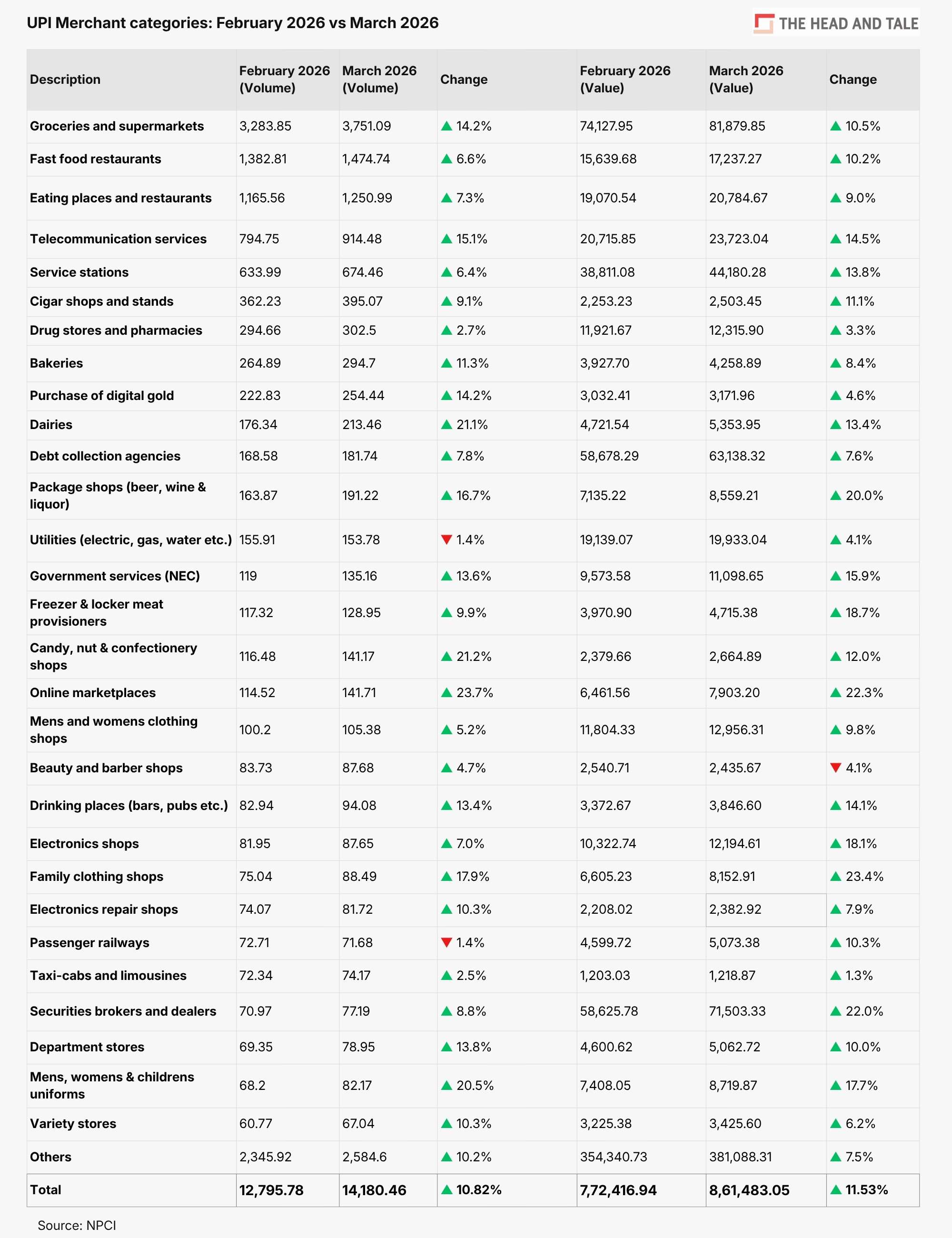 Telecommunication services posted a notable jump, with transaction value rising to Rs 23,723.04 crore in March from Rs 20,715.85 crore in February, on 914.48 million transactions versus 794.75 million.