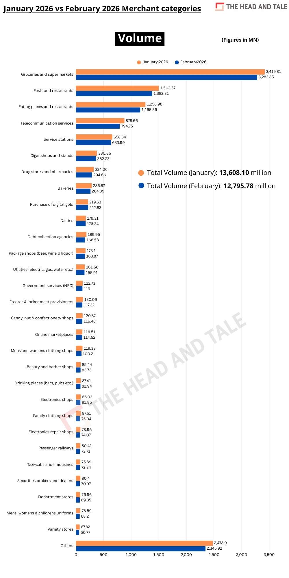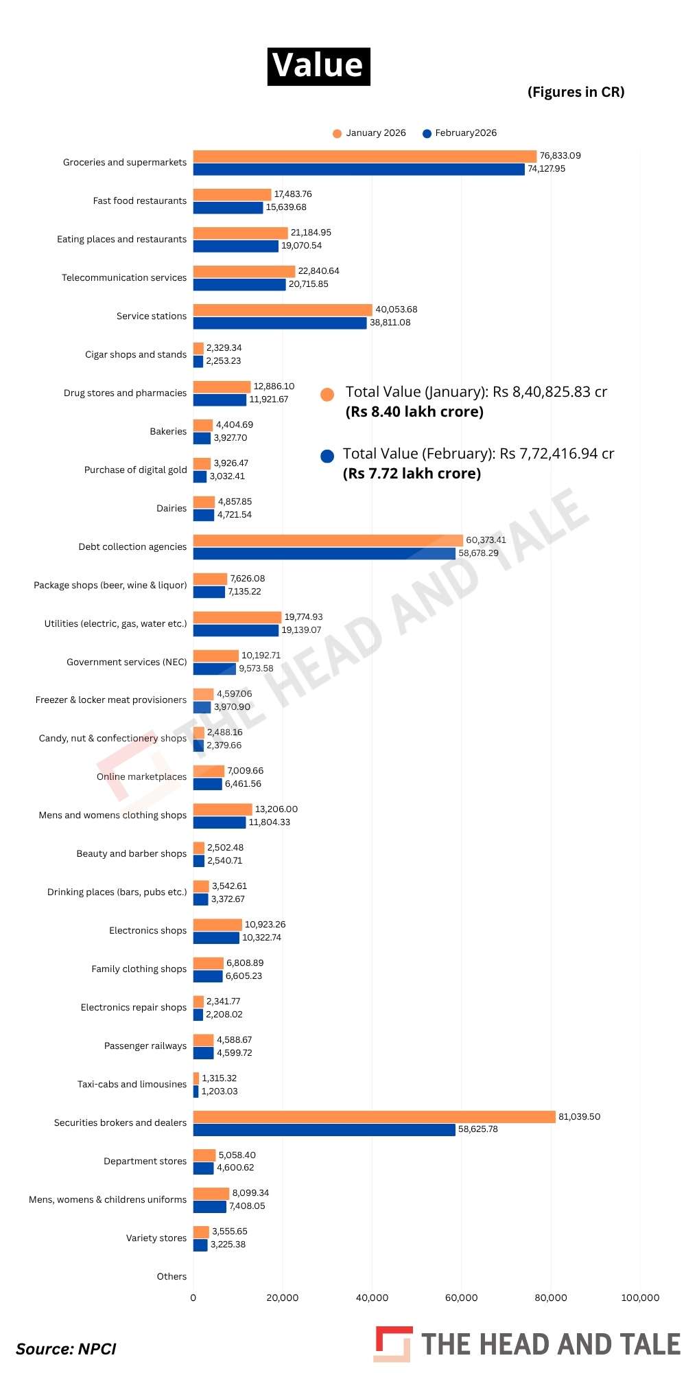 Groceries and supermarkets, which account for the largest share, recorded 3,283.85 million transactions worth Rs 74,127.95 crore in February versus 3,419.81 million transactions worth Rs 76,833.09 crore in January.