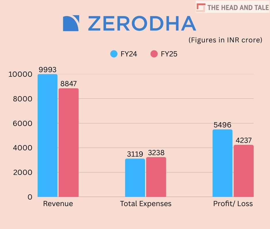 Zerodha's net profit narrowed to Rs 4,237 crore in FY25 from Rs 5,496 crore in the previous fiscal, according to consolidated financial statements sourced from the Registrar of Companies.