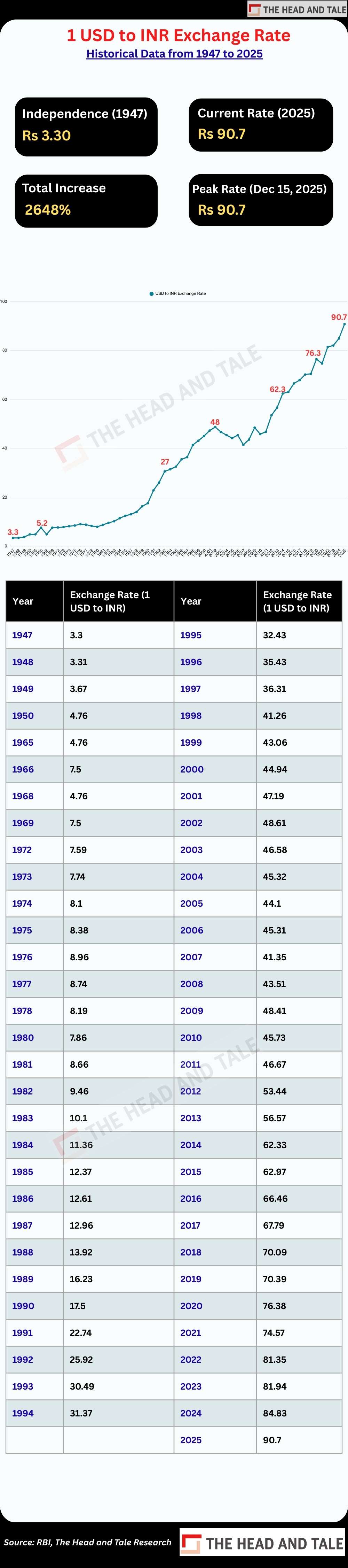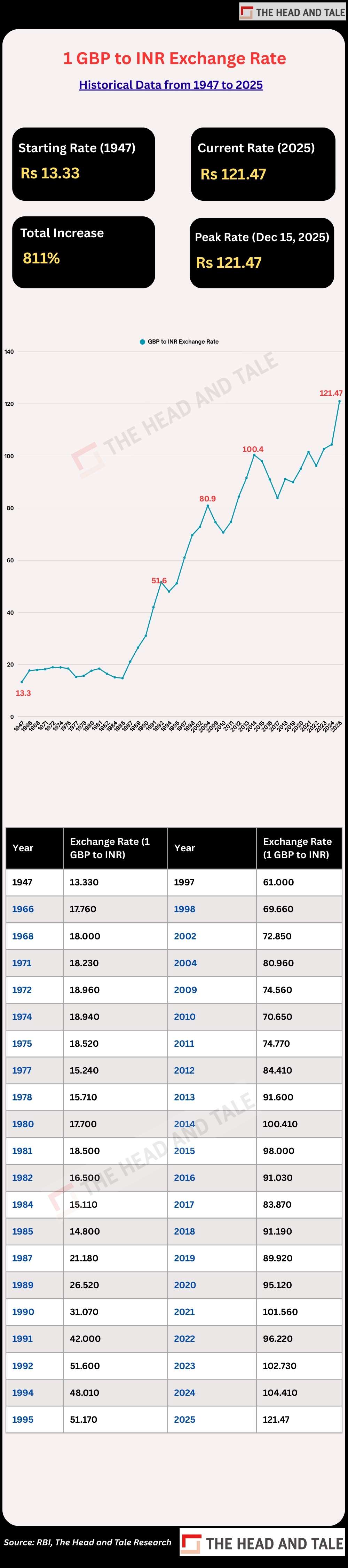This long slide has taken the rupee from Rs 17.90 per USD in 1991 to a peak of Rs 90.7 in December 2025. Against the pound, it has moved from Rs 13.33 in 1947 to Rs 121.47 today.