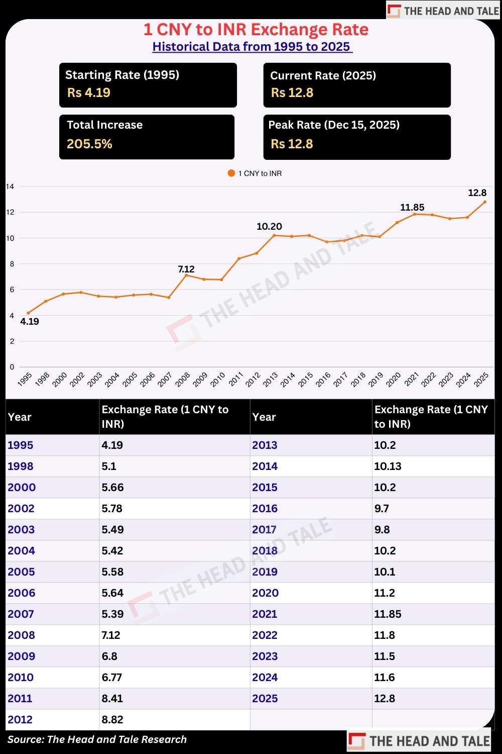 The Chinese yuan tells a different story. India began widely tracking its rate in the mid-1990s, just as China's economy was booming. In 1995, 1 CNY was Rs 4.19 -- and now it is Rs 12.8. The yuan has strengthened as China's export engine grew, while the rupee has weakened due to recurring current account pressures.